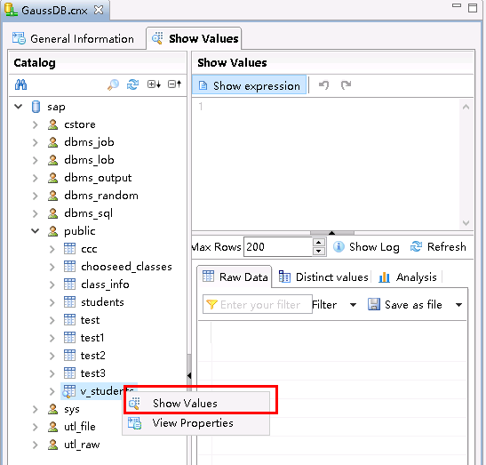 - 右键表或视图,点击”Show Values”,可以查看数据内容,同时右侧可以设置一些常用属性