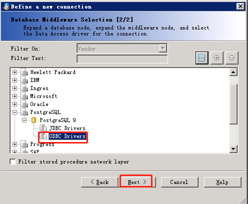- 在列表中选择“PostgreSQL -> PostgreSQL 9 -> ODBC Driver”, 后点击“Next”
