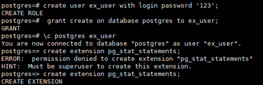 我们在pg_stat_statements.control文件里加上trusted = true之后尝试用普通用户创建该插件: