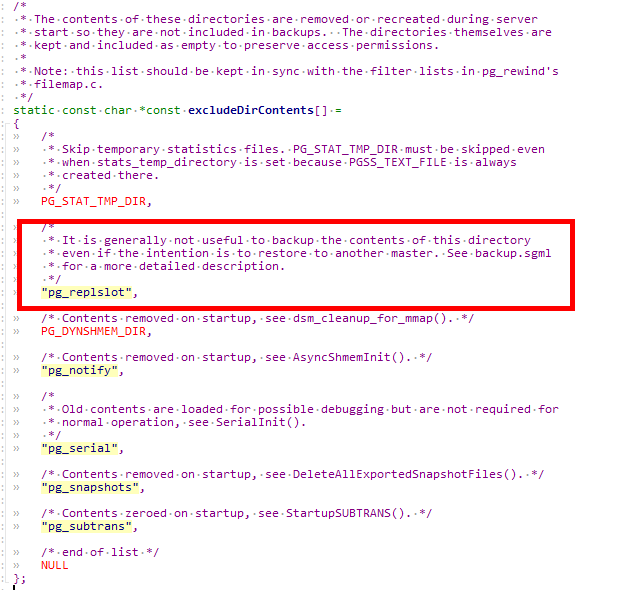 结合代码,我们发现pg_replslot目录下的文件是会被忽略的,不会备份