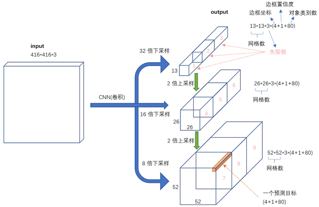 不考虑神经网络结构细节的话,总的来说,对于一个输入图像,YOLO3将其映射到3个尺度的输出张量,代表图像各个位置存在各种对象的概率。
