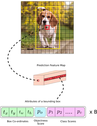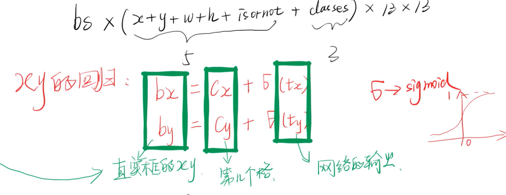物体分数:表示一个边界框包含一个物体的概率,对于红色框和其周围的框几乎都为1,但边角的框可能几乎都为0。物体分数也通过一个sigmoid函数,表示概率值。