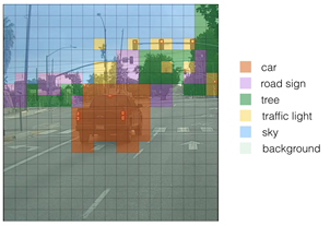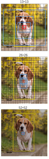 首先通过特征提取网络对输入特征提取特征,得到特定大小的特征图输出。输入图像分成13×13的grid cell,接着如果真实框中某个object的中心坐标落在某个grid cell中,那么就由该grid cell来预测该object。每个object有固定数量的bounding box,YOLO v3中有三个bounding box,使用逻辑回归确定用来预测的回归框。