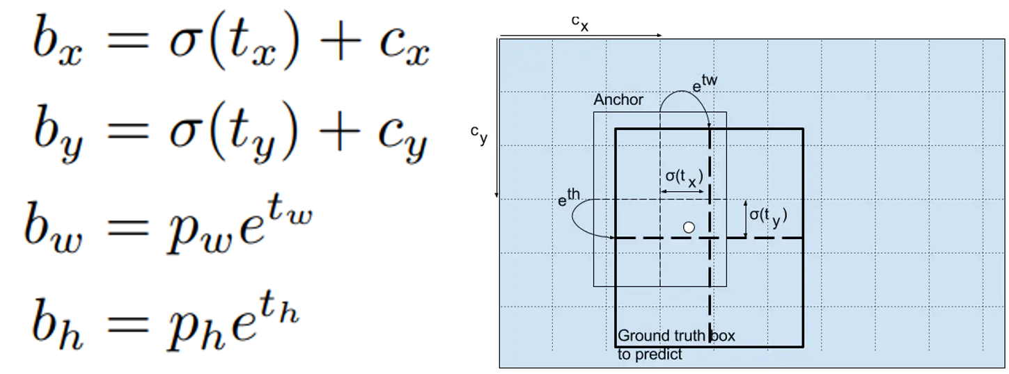 Yolo v3采用直接预测相对位置的方法。预测出b-box中心点相对于网格单元左上角的相对坐标。直接预测出(tx,ty,tw,th,t0),然后通过以下坐标偏移公式计算得到b-box的位置大小和confidence。