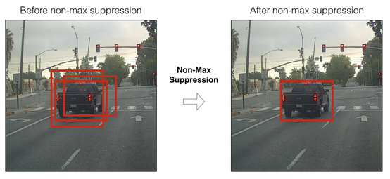 具体使用以下步骤:抛弃分数低的框(意味着框对于检测一个类信心不大);当多个框重合度高且都检测同一个物体时只选择一个框(NMS)。