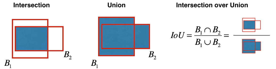 即使通过类分数阈值过滤一部分锚框,还剩下很多重合的框。第二个过程叫NMS,里面有个IoU,如下图所示。