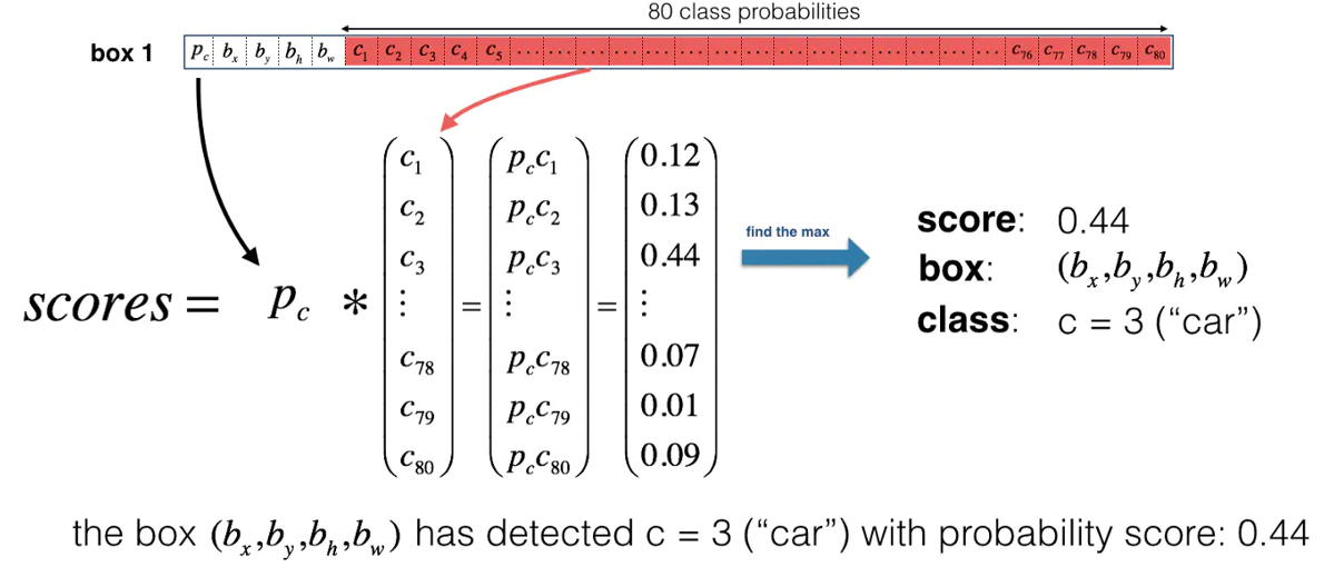 每个锚框我们计算下面的元素级乘法并且得到锚框包含一个物体类的概率,如下图: