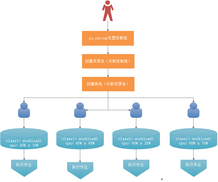 GaussDB(DWS)的CPU资源管理通过Cgroup实现,Cgroup是linux内核提供的限制和隔离进程组使用物理资源的机制,可以组成层次形式,即控制树。GaussDB(DWS)提供gs_cgroup工具,负责创建默认控制组、创建用户自定义控制组、删除用户自定义控制组、更新用户自定义组的资源配额和资源限额、显示控制组配置文件内容、显示控制组树形结构和删除用户的所有控制组。CPU资源管理原理如下图:
