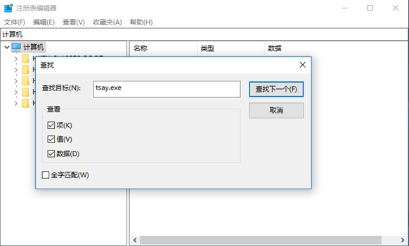 使用“regedit”命令打开注册表,通过“Ctrl+F”命令打开搜索框,分别搜索 “tsay.exe”和“ttry.exe”,将搜索到的所有包含该字符串的注册表键全部删除。