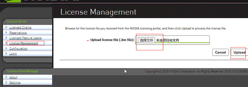 - 浏览器中,访问License Server管理界面的主页:http://ip:8080/licserver,点击“License Management”,将刚下载保存好的许可证*.bin文件,并点击Upload。如下图所示: