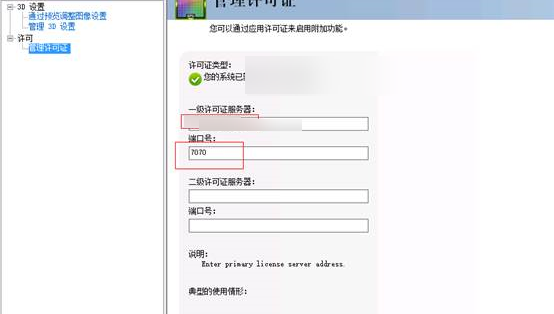在一级许可证服务器中填入部署的license server的ip和端口(如果有备用服务器,就在二级许可证服务器中填入部署的license server的ip和端口),并点击应用