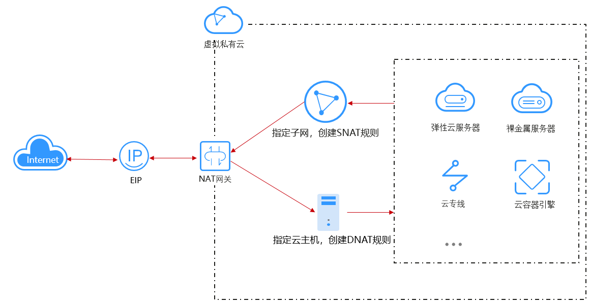 SNAT功能通过绑定弹性公网IP,实现私有IP向公有IP的转换,可实现VPC内跨可用区的多个云主机共享弹性公网IP,安全,高效的访问互联网。