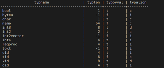 常见的数据类型有布尔类型、字节类型、字符类型、名字、整数类型、字符串类型、OID类型等;这在typname一列可以看到。