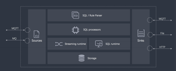 整体架构可分为3部分,左侧为sources,代表数据来源的位置,数据来源可能是KubeEdge里面有个边缘端的MQTT macOS broker,也可能是文件、窗口、数据库;