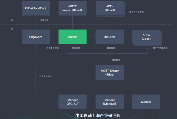 Kuiper是装在 KubeEdge MQTT Broker后面,整个都运行在边缘端,底下为不同的Mapper,也就是接入各种各样不同的协议。边缘MQTT Broker用来交换消息。