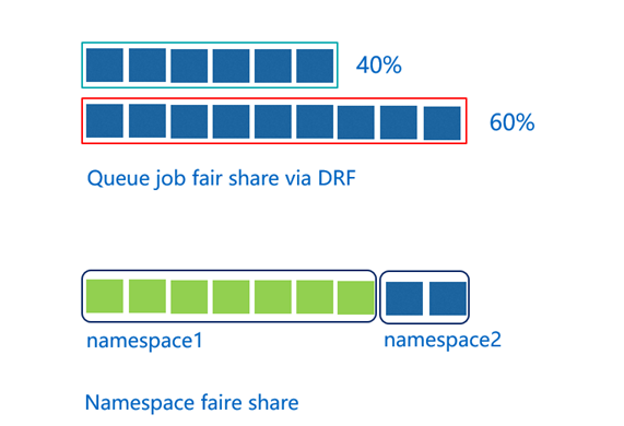 在通过队列做资源共享时,我们提供了多种机制。图最上面的这种,这里面我们创建两个队列,通过这两个队列去共享整个集群的资源,一个队列给他分40%的咨询资源,另一个给他分60%的资源,这样的话就可以把这两个不同的队列映射到不同的部门或者是不同的项目各自使用一个队列。这在一队列里,资源不用的时候,可以给另外一个队列里面的作业去使用。下面讲的是两个不同的namespace之间的资源平衡。Kubernetes里当两个不同的应用系统的用户都去提交作业时,提交作业越多的用户,他获得的集群的资源会越多,所以在这里面基于namespace,我们进行公平的调度,保证namespace之间可以按照权重分享集群的资源。