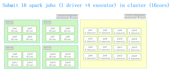 举个例子,我们在做性能测试的时候,提交16个并发的作业,对于每个作业来讲,它的规格是1 driver+4 executor,整个集群总共有4台机器16个核,这样的一个情况。