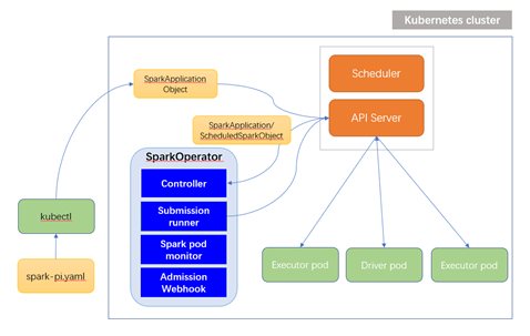 第二种Spark on Kubernetes的使用方式就是operator。operator是更Kubernetes的方式,你看他的整个作业提交,先是yaml文件通过kubectl提交作业,在这里面它有自己的crd,即SparkApplication,Object。创建了SparkApplication之后, Controller可以watch到这些资源的创建,后边流程其实是复用的第一种工作模式,但是通过这种模式,做的更完善的一些。