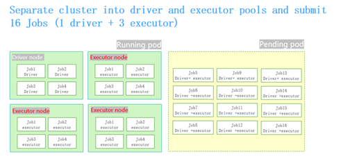 同时提交16个spark job的时候,driver pod的创建和executor pod的创建之间有一个时间差。因为有这个时间差,当16个spark的job跑起来之后把整个机群全部占满了,就会导致同时提交并发量特别大作业的时候,整个集群卡死。