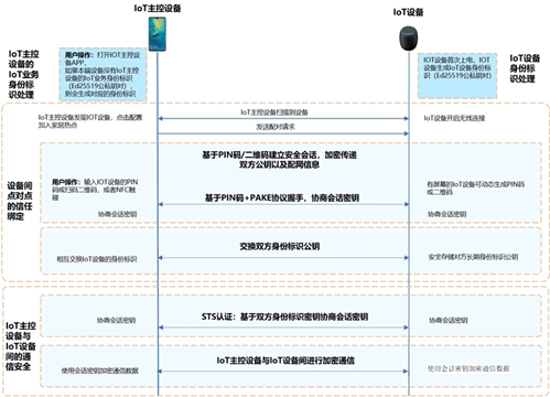 设备之间的互联、互通需要建立点对点的信任关系,并在具备信任关系的设备间构建安全的连接通道,实现用户数据端到端的加密传输。建立点对点信任关系的过程即是相互交换设备的身份标识的过程。信任关系的建立相当于一次握手,譬如:A设备发送密文给B设备,B成功解密并把自己的信息封装到报文中再次加密传输给A,A拿到报文再次解密确认是B.