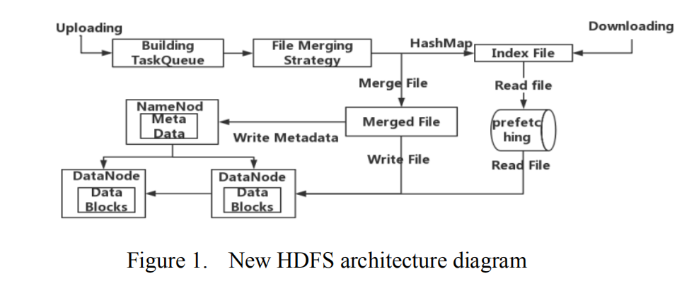 整体架构如下图所示:由原来的HDFS的NameNode、DataNode,与新增的组件中各个模块组成——Building TaskQueue(小文件队列)、File Merging Strategy(小文件合并)、Index File(索引文件)、Prefetching(预取)。