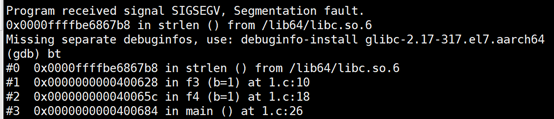 我们通过gdb运行后,可以看到strlen地方会触发SEGFAULT,引发进程挂掉