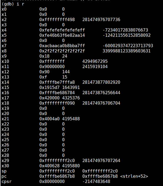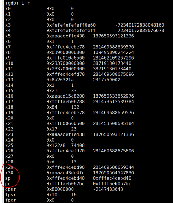 先看info register,关注x29、x30、sp、pc四个寄存器的值