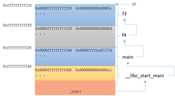 可以看到,f4函数开辟的栈空间也是为48字节,因此,倒推frame3的栈顶为当前的0xfffffffff2c0 + 48字节:0xfffffffff2f0