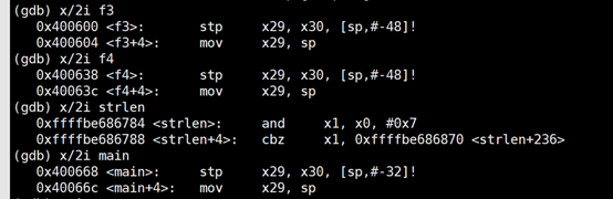 从当前的sp开始,frame 0是strlen,这块没有开栈,因此上一级的调用函数仍然是x30,因此推导:frame1调用为f3