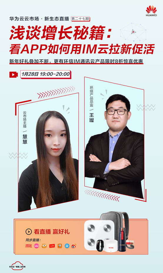 观看在线直播请访问华为云云市场,点击云市场直播间选择“新生态在线直播第二十七期——《浅谈增长秘籍:看APP如何利用IM云拉新促活》”即可进入,直播期间(2021年1月28日19:00-21:00)进入华为云云市场·新生态直播间观看直播并下单环信即时通讯云产品还享限时8折优惠!新年诚意满满!优惠力度超前!