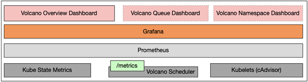 目前在Volcano 中引入了三个监控组件,Kube State Metrics,Prometheus以及Grafana。