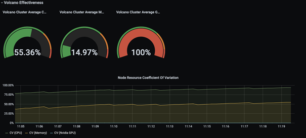 通过Volcano调度效率数据,我们可以看到整体集群的资源申请request情况,通过Node Resource Coefficient Of Variation 我们可以看到不同节点之间的资源分布情况。