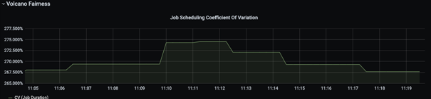 Job Scheduling Coefficient Of Variation 是 Volcano 监控的公平性指标,展示了不同Job调度时间长度之间的差异值,目前的插件策略下,是相对比较极端的,部分Job在非常短的时间内被调度完成,剩余的时间比较长。