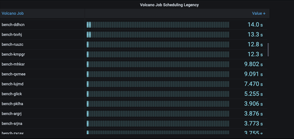 通过 Volcano Job Scheduling Legecny 我们可以看到当前运行比较长的Vocalno Job运行时间长度,通过比对Scheduler日志,我们可以逐步找到相应的原因,并且调整插件来优化这个过程。