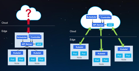 当时我们做了很多探索。考虑如下图两种基本架构,一种是在每一个分公司都搭建K8s集群,然后把它纳入到云中心的K8s集群,另一种是每个分公司的机器都作为一个节点,纳入到云中心统一管理。