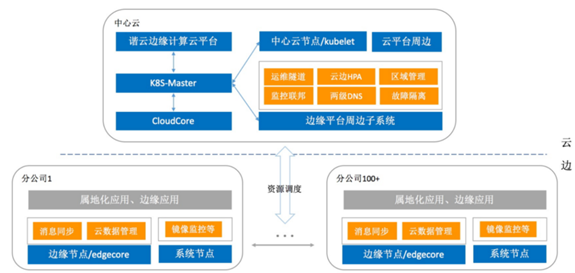 中心云是基于谐云的边缘计算云平台搭建了一个云中心,包含高可用的k8s集群、Master以及CloudCore。在各个分公司作为 edgecore加入到云中心,在云中心做统一的资源调度。从云中心到每个分公司,传统运维会比较麻烦,现在可以通过云中心用隧道远程做分公司节点方面的运维,云边的弹性伸缩,边的区域化管理。