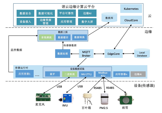 该跨海大桥上面有许多的终端设备,比如用来收集温度湿度、做雨雪(在上面加滴水,立即就能够展示出来)、用来采集粉尘能够更加细腻度感知PM2.5等设备,这些设备都需要一个载体将其接入我们这块板子上面,板子是基于单点系统的,所以我们最终将板子作为edgecore,接入整个边缘计算云平台。