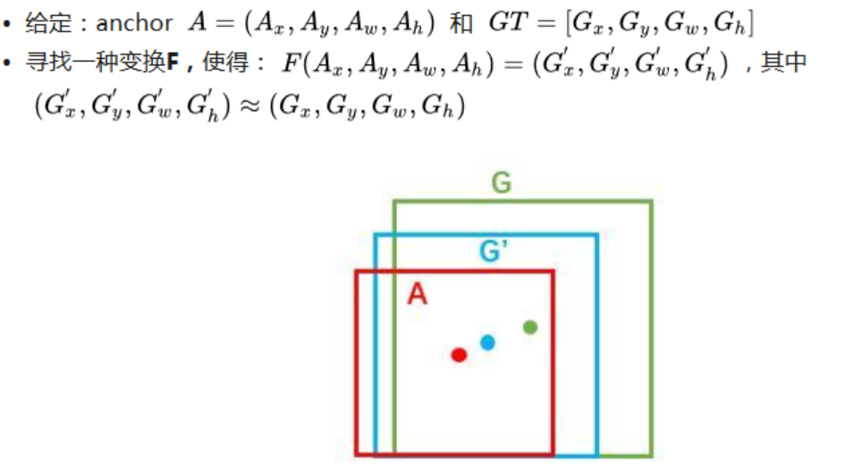 目标:寻找一种关系使得输入原始的anchor A 经过映射得到一个跟真实窗口G更接近的回归窗口G’。