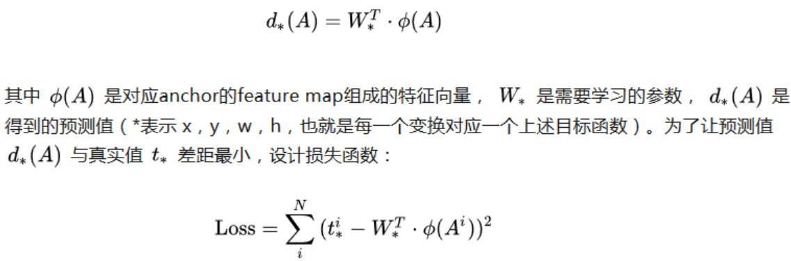 线性回归就是给定输入特征向量X,学习一组参数W,使得经过线性回归后的值跟真实值Y非常接近。即Y=WX。对于该问题,输入X是feature map定义为φ;同时还有训练传入A与GT之间的变换量即(tx,ty,tw,th),输出是dx(A), dy(A), dw(A), dh(A)这四个变换那么目标函数可以表示为:
