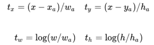 在FasterRCNN中 foreground anchor与ground truth之间的平移量(tx, ty)与尺度缩放因子(tw,th)关系如下: