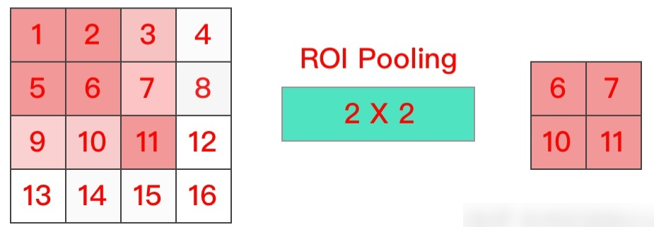 如上图所示,假设Feature Map大小为4x4,候选ROI区域大小为3x3,通过2x2的ROI Pooling Layer得到2x2的归一化输出。4个划分后子窗口分别为1、2、3、5(5最大),3、7(7最大),9、10(10最大),11(11最大),然后对每个子窗口做Max Pooling。