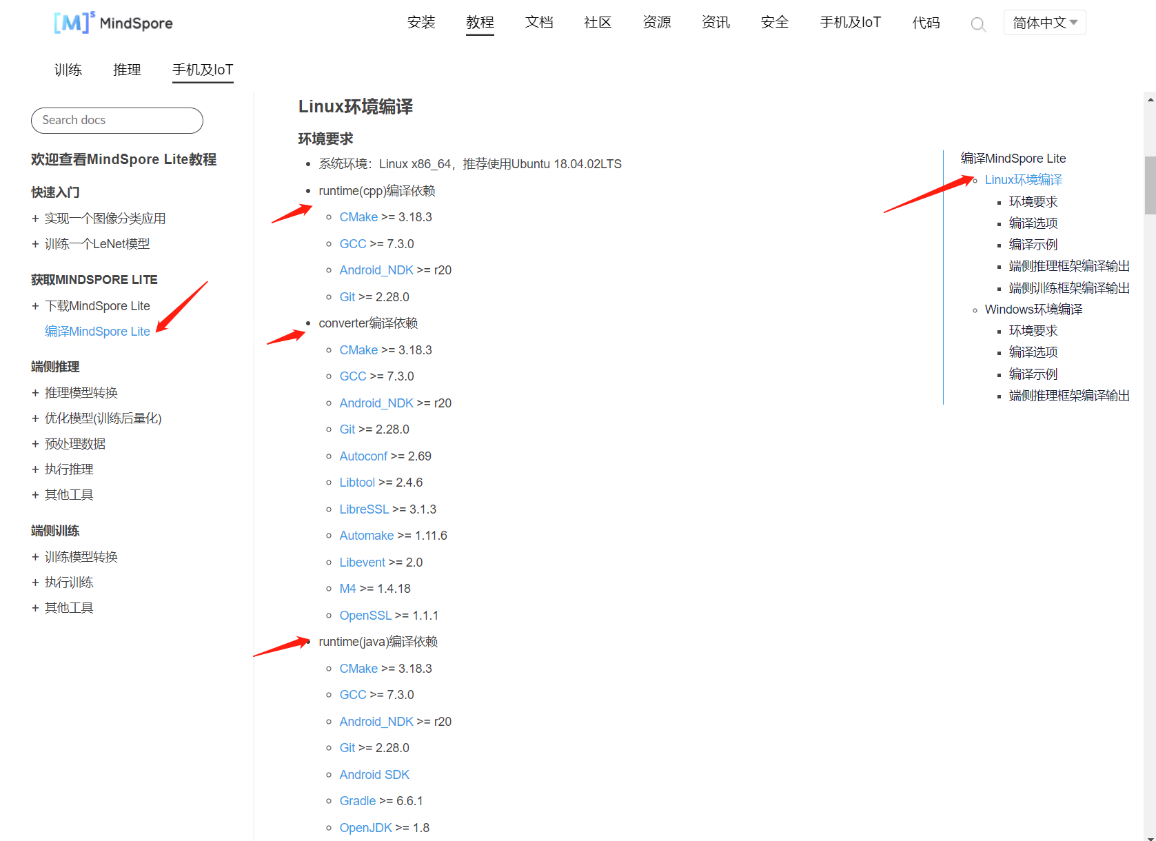 打开安装文档的页面 https://www.mindspore.cn/tutorial/lite/zh-CN/r1.1/use/build.html#linux