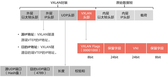 - VXLAN报文(的外层IP头部)中源IP地址为源端VTEP的IP地址,目的IP地址为目的端VTEP的IP地址。