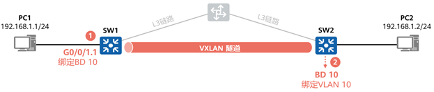 - 二层子接口方式接入,例如本例在SW1创建二层子接口关联BD 10,表示仅这个接口下的特定流量注入到BD 10。