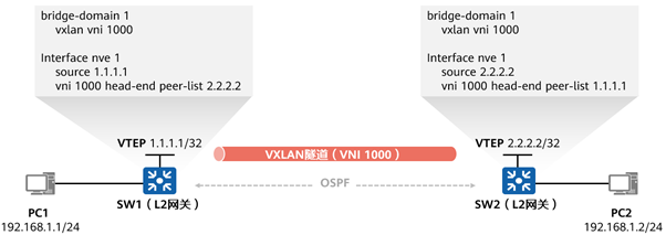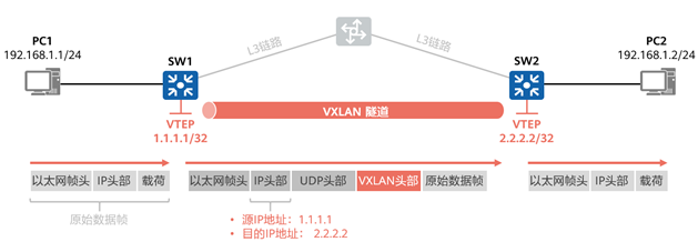 VXLAN隧道由一对VTEP IP地址确定,报文在VTEP设备进行封装之后在VXLAN隧道中依靠路由进行传输。在进行VXLAN隧道的配置之后,只要VXLAN隧道的两端VTEP IP是三层路由可达的,VXLAN隧道就可以建立成功。
