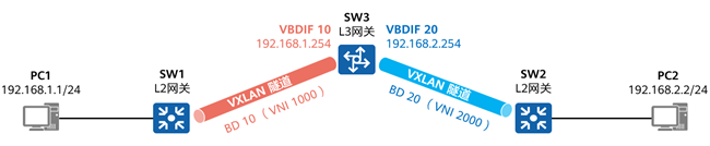- 类似于传统网络中采用VLANIF解决不同广播域互通的方法,在VXLAN中引入了VBDIF的概念。