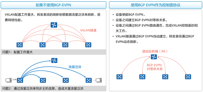 最初的VXLAN方案(RFC 7348)中没有定义控制平面,即用户需手工配置VXLAN隧道,然后通过流量泛洪的方式学习主机地址,这种方式会导致网络中存在很多泛洪流量,并且网络扩展起来困难。