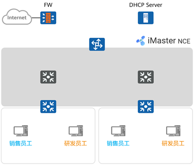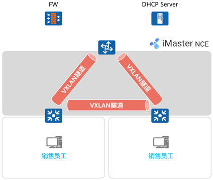 - 通过iMaster NCE(华为园区网络SDN控制器)实现全网设备集中管理,管理员通过图形化界面实现网络配置。