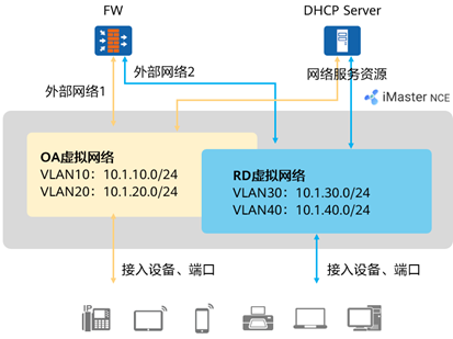 - 用户分别创建OA及RD虚拟网络,指定虚拟网络的IP网段/VLAN、网关地址、所关联的外部网络及网络服务资源,以及终端接入点位。