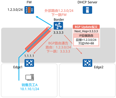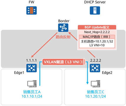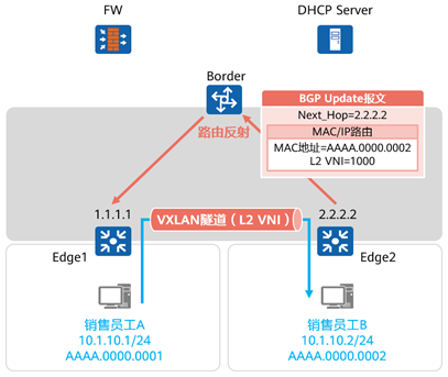 - 以销售员工B为例,Edge2将其MAC地址通过BGP更新报文通告给Border,后者将其反射给Edge1。